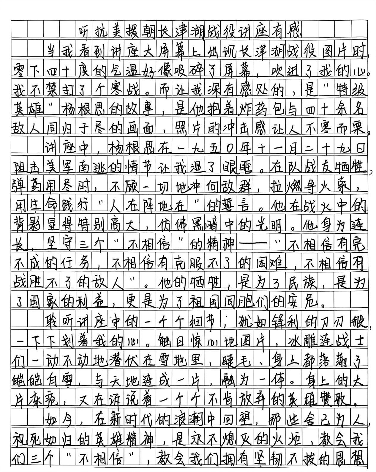 刘武松老师以饱满的热情、生动的语言,结合自身从军25年的经历,为同学们娓娓道来。从朝鲜战争的爆发缘由、我国抗美援朝的决策背景,到九兵团血战长津湖的惨烈历程,刘老师用详实的史料、鲜活的英雄故事,将同学们带回了70多年前那个冰天雪地的战场。他重点讲述了“北极熊团”被全歼、三炸水门桥的壮烈战事,以及杨根思烈士与敌人同归于尽、“冰雕连”战士坚守阵地直至冻僵的感人事迹。一个个惊心动魄的战斗场景,一个个舍生取义的英雄形象,让同学们深受触动,现场不时响起阵阵掌声。