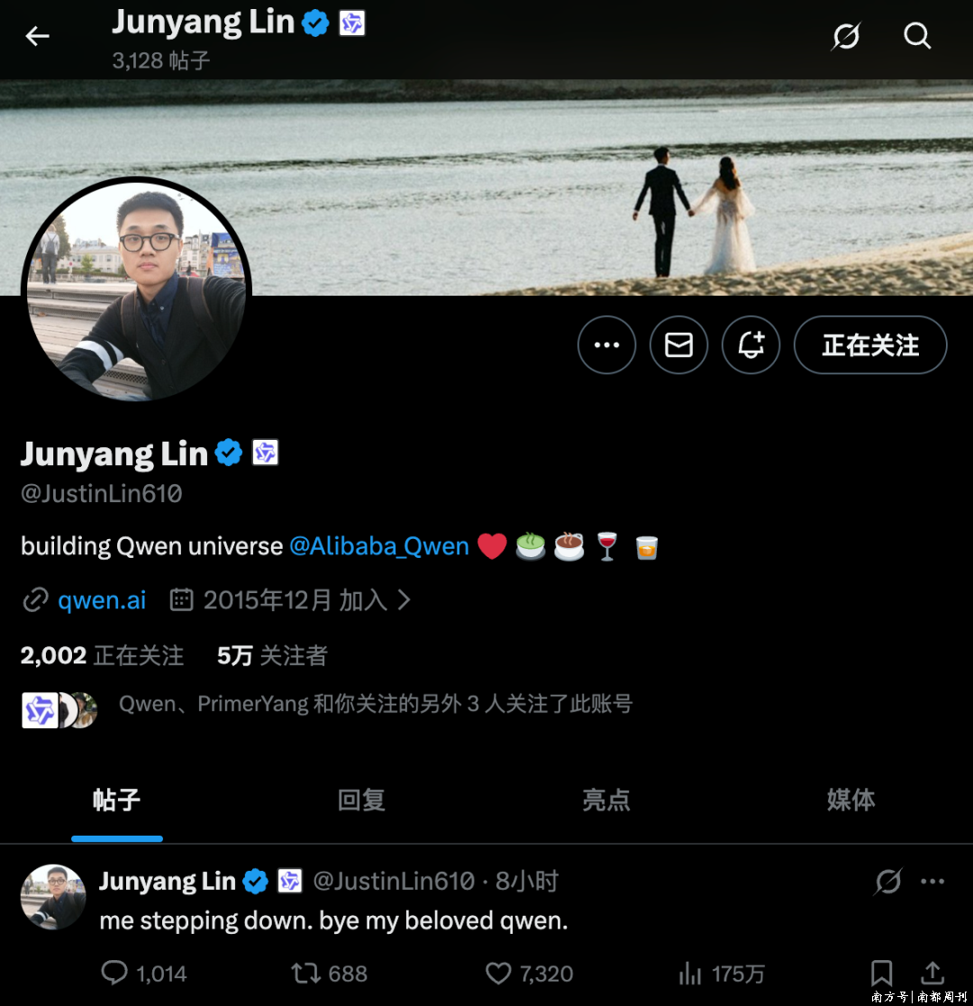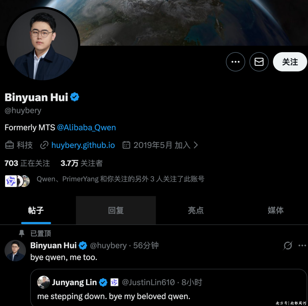 3月4日凌晨,阿里Qwen技术负责人林俊旸在社交平台上与千问道别,称“我退出了”。随后,阿里巴巴通义实验室科学家惠彬原(Binyuan Hui)转发该条博文并表示自己也退出了千问。南都N视频记者就此向阿里云方面求证,截至发稿尚无回复。