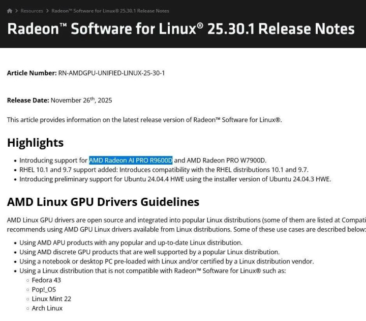 据报道AMD正在准备两款新的专业GPU:Radeon AI Pro R9700S和Radeon AI Pro R9600D,它们均衍生自10月27日发布的Radeon AI Pro R9700。最近,Linux版25.30.1驱动中出现了R9600D的踪迹,消息称两款新品有望在2026年CES前后正式发布。